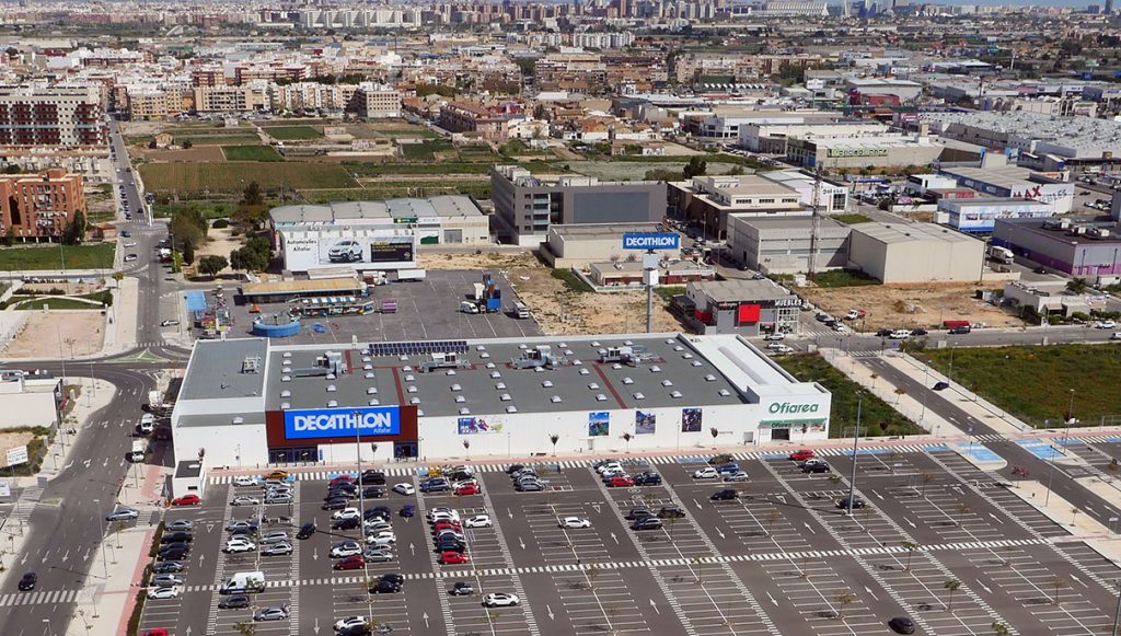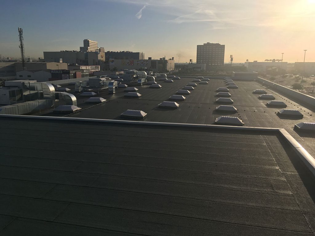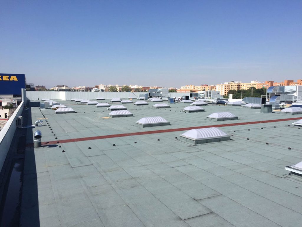 TIENDA DECATHLON ALFAFAR (VALENCIA) AÑO 2016 ++++ 6.500 m2 cubierta deck acabada en lámina asfáltica autoprotegida con gránulo mineral. Iluminación cenital mediante claraboyas de policarbonato. Colocación de líneas de vida definitivas.